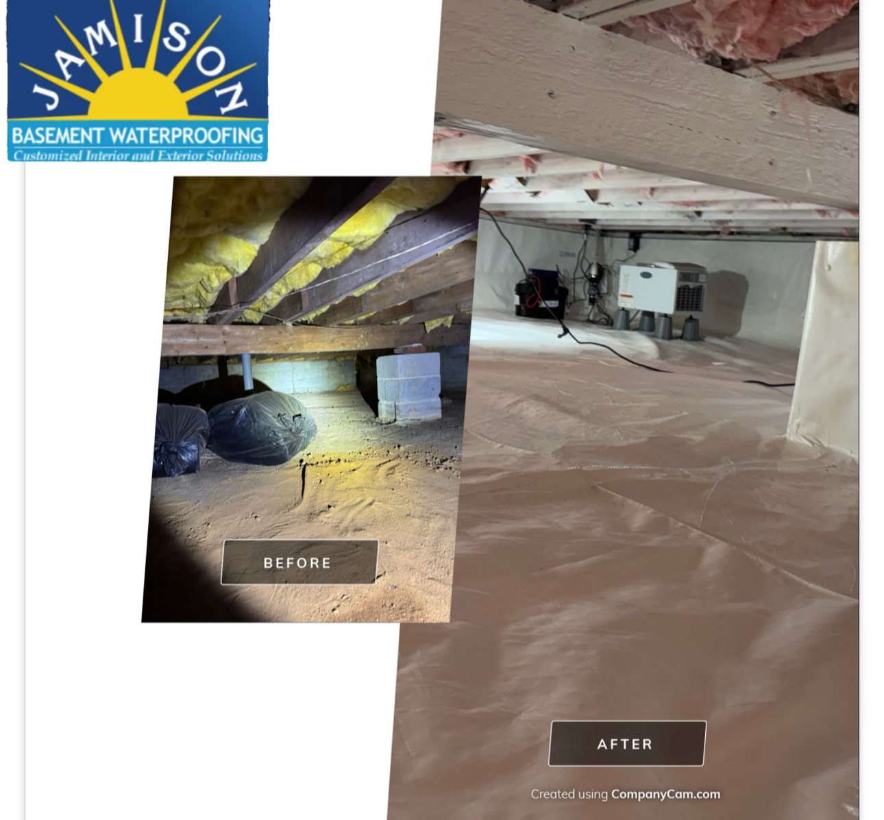 Chrissy who experienced significant moisture in her crawl space. The Jamison waterproofing team identified signs of microbial growth, on the ceiling and damp walls. To address this, they recommended encapsulating the crawl space with a vapor barrier to block moisture from the exposed ground. Additionally, they suggested installing powerful dehumidifiers and sump pump and GrateDrain drainage system to prevent potential flooding and maintain a dry environment