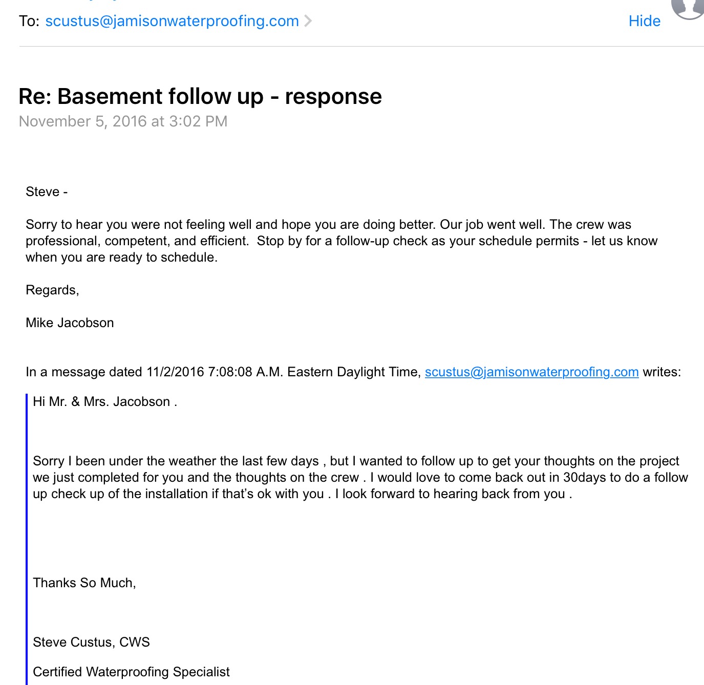 The homeowners have been getting ground water seepage for that past few years and they finally have gotten tired of it . All the shop vacuuming up water during heavy rains ran its course . So they figure they give us a call .