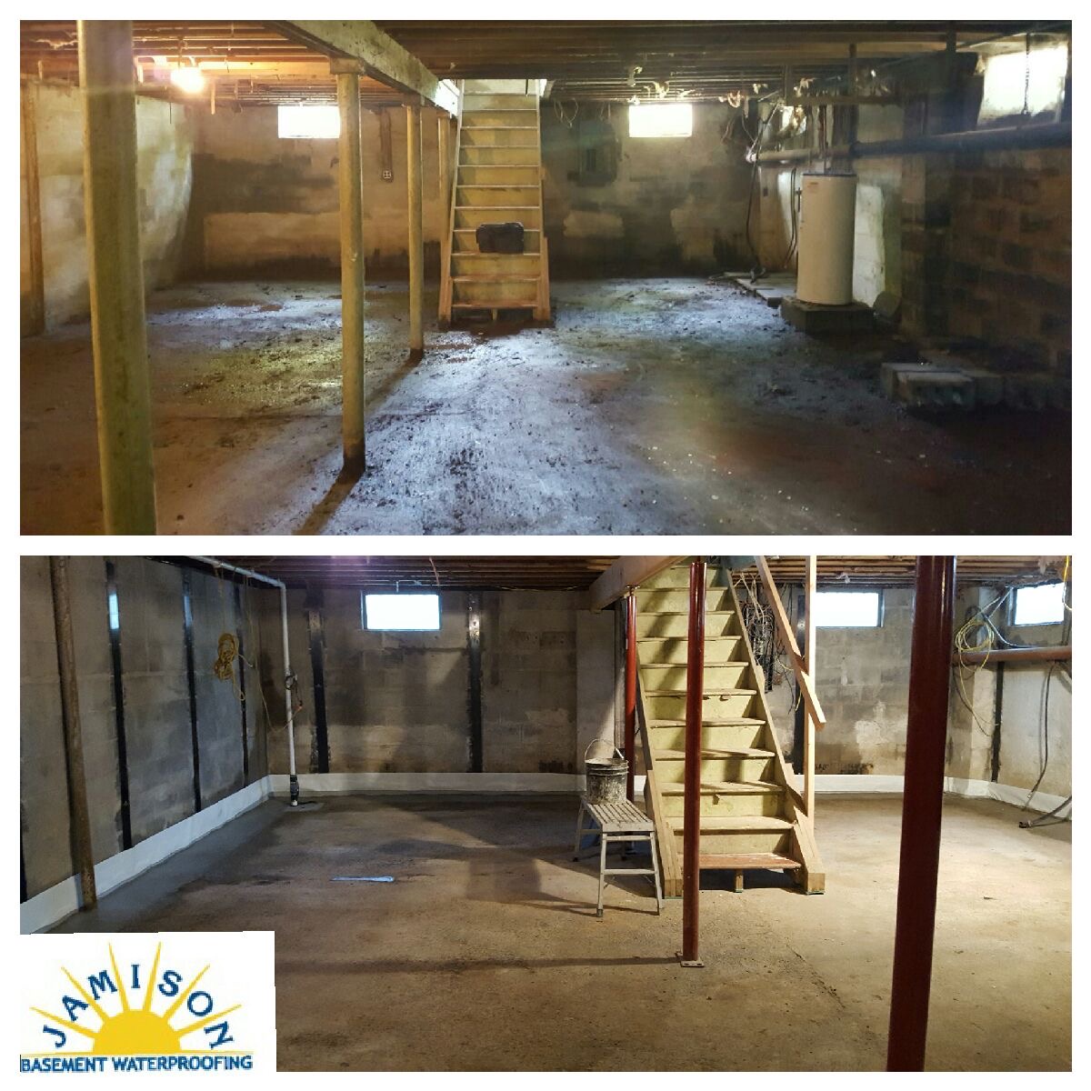First we took care of the Bowing walls with the reinforcer wall stabilizing wall straps than we took care of the water problem with a full perimeter drainage system with two sump locations than we added seven glass block Windows and power wash the floor down .